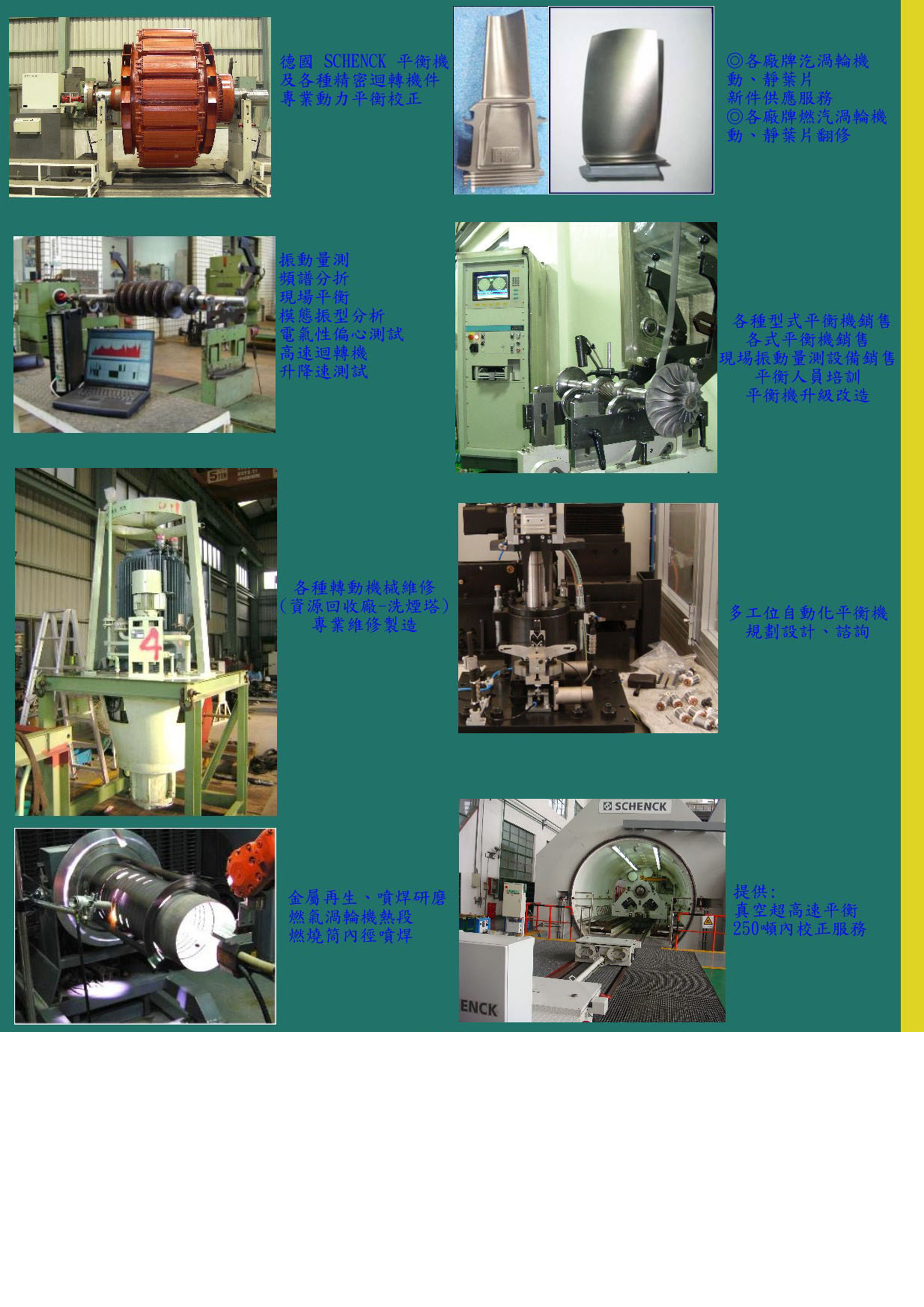 動平衡能力 0.1kg ~ 40頓. 最大直徑 4M、長度 13M