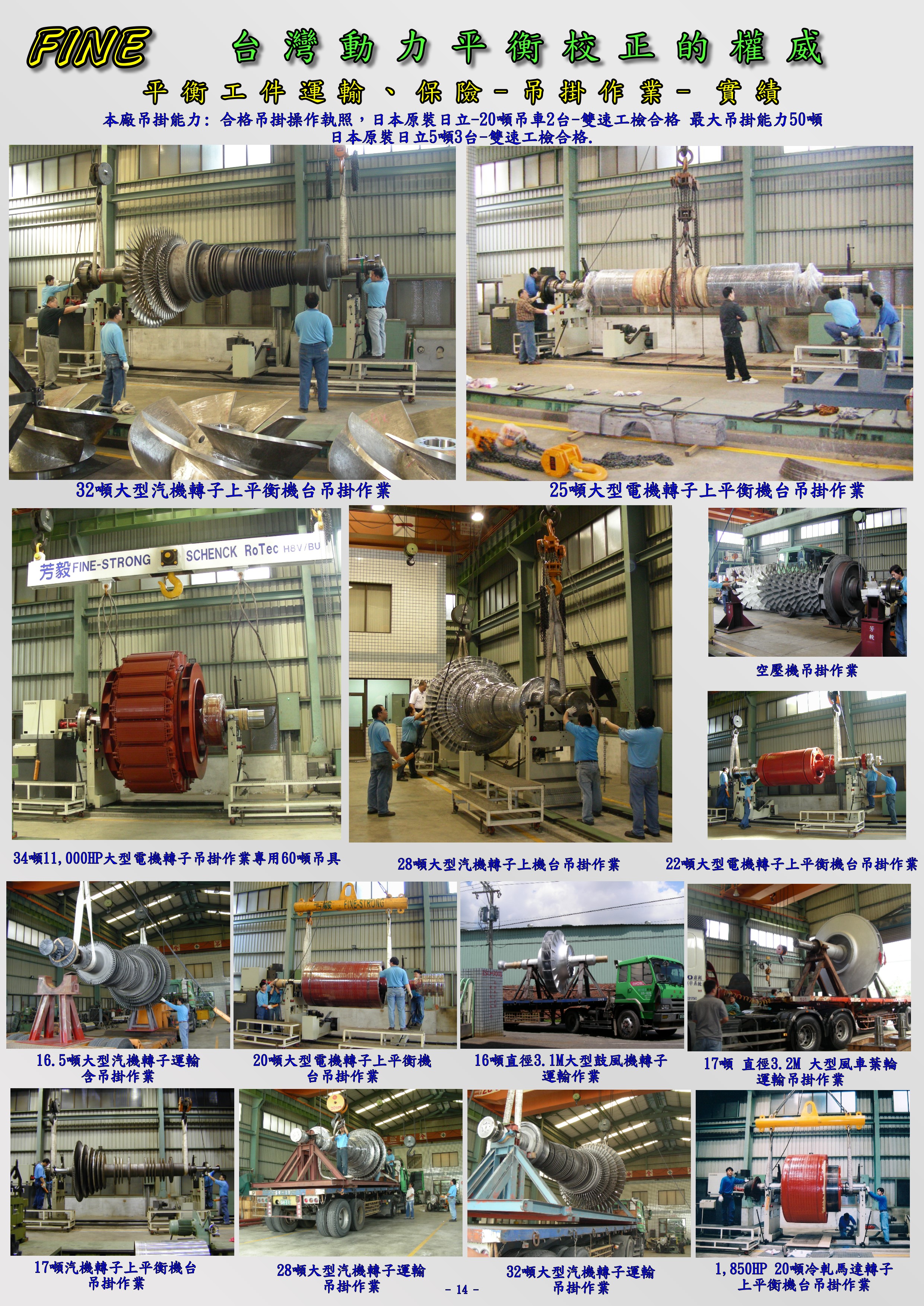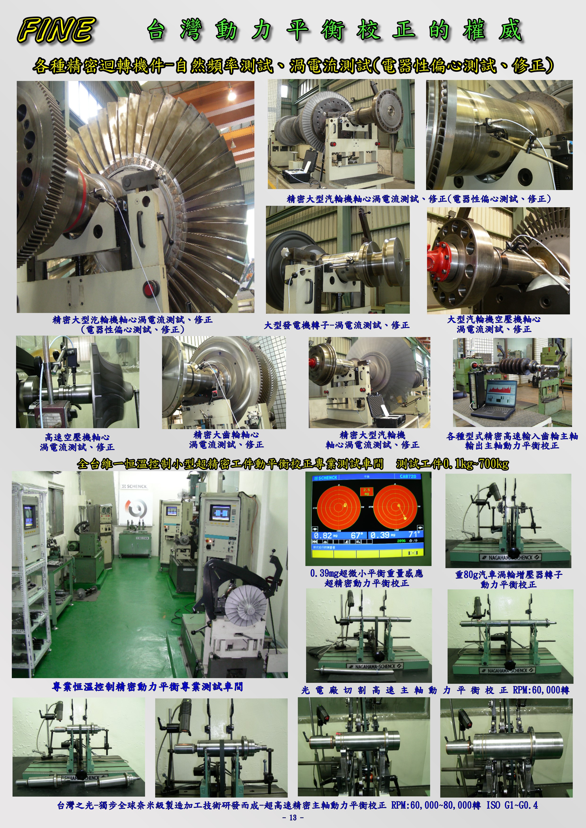 動平衡能力 0.1kg ~ 40頓. 最大直徑 4M、長度 13M